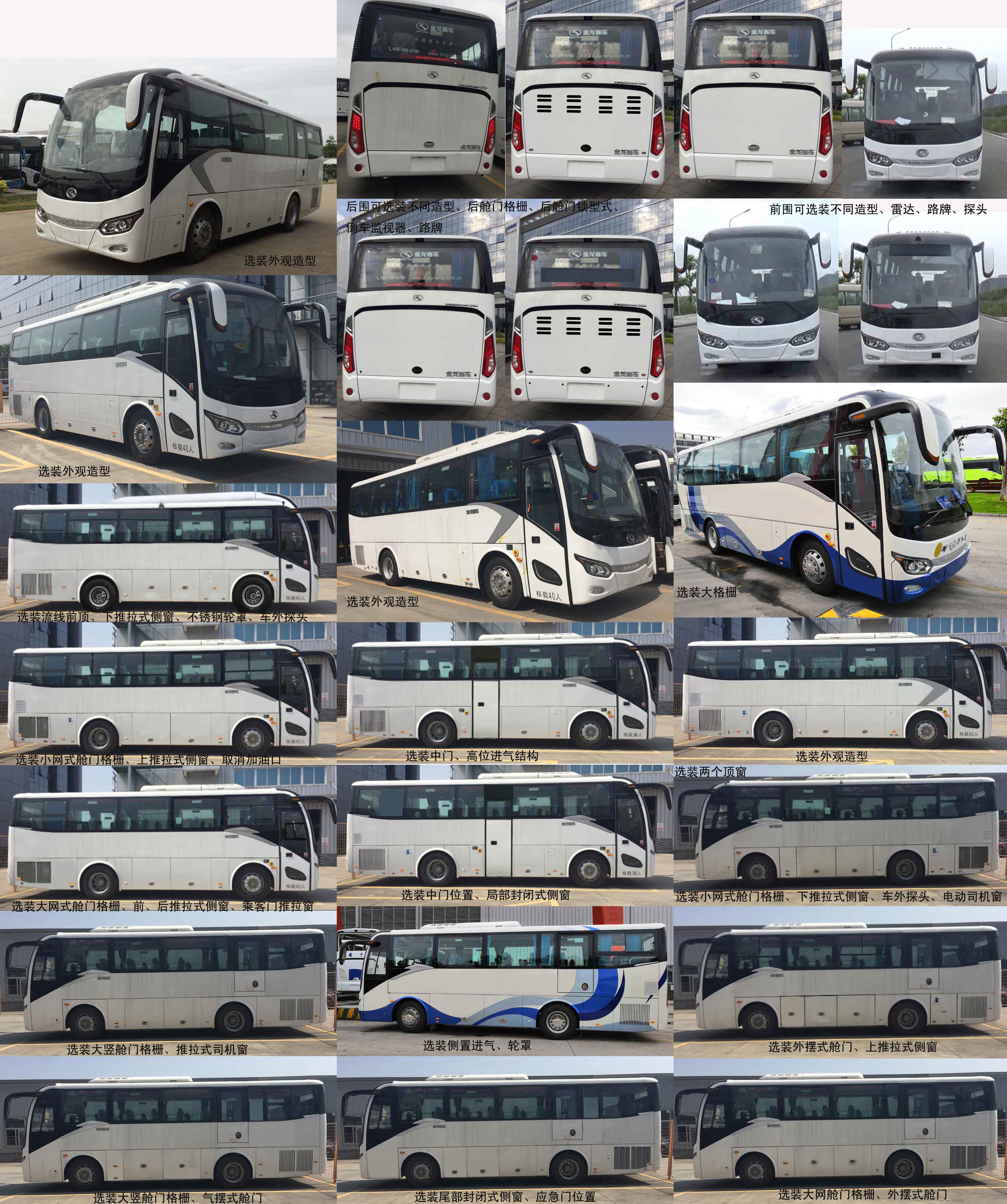 1.侧窗可选装局部封闭式或选装局部推拉式或选装局部推拉式与局部封闭式相结合;2.乘客门可选装推拉窗或封闭窗,选装后舱门格栅,选装前围、侧围、后围造型;3.右侧2个乘客门时,对应额定载客(含驾驶员位)为24-38;右侧1个乘客门时,对应额定载客(含驾驶员位)为24-40;4.座椅布置状态为2+1时,仅对应右侧1个前乘客门+左侧1个应急门状态,靠通道座椅两侧有扶手且间距不小于500mm,无左右调整功能;5.安全出口数量为7时:“4个应急窗,1个乘客门,1个应急门,1个或2个安全顶窗”或“4个应急窗,2个乘客门,1个或2个安全顶窗”;安全出口数量为8时:4个应急窗,2个乘客门,1个应急门,1个或2个安全顶窗;6.空气调节装置可选装“冷暖”状态,配置关系如下:型号KL-IVY(厦门金龙汽车空调有限公司)+型号YJP-Q25(河北宏业永盛汽车加热器股份有限公司(加热器));7.选装液力缓速器时,电涡流缓速器的隔热装置和报警系统不适用。8.缓速器型式及型号为:电涡流缓速器/Telma01(选装),电涡流缓速器/TLC-3000(选装),液力缓速器/FH240(选装),选装电涡流缓速器时,同时安装电涡流缓速器报警系统和隔热装置;9.选装钢板弹簧非独立悬架时,对应匹配玉柴YCS06270-62型发动机,油箱距前/后端距离为:2905/5710mm;10.选装空气弹簧非独立悬架时,对应油箱距前/后端距离为:2620/5995mm。 |