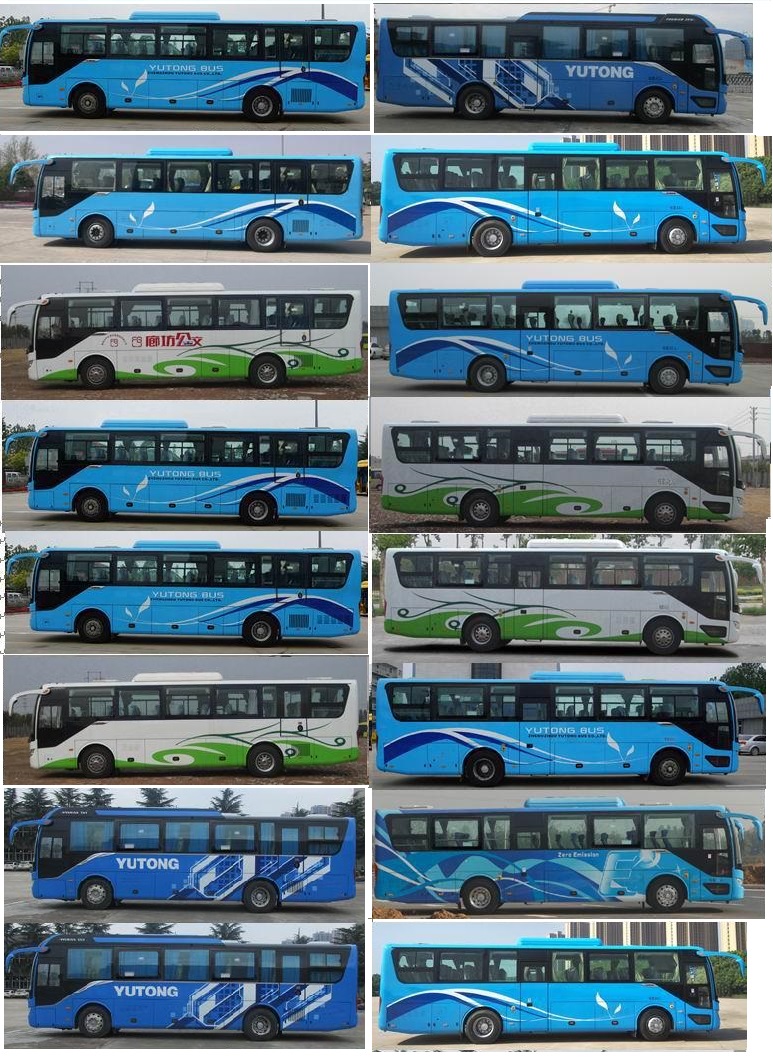 1.除外推式应急窗外,其他侧窗、乘客门玻璃、司机窗玻璃可选装其他型式;2.前围、侧围、后围"宇通LOGO"装饰件可选装其他型式,顶盖造型装饰件可选装其他型式;3.可选装前、后、侧路牌;4.可选装其他型式舱门,舱门可选装带格栅或不带格栅状态;5.可选装其他型式前雾灯;6.可允许外接充电;7.选装低配时对应整备质量为11200kg,选装标配时对应整备质量为11500kg,选装中配时对应整备质量为11800kg,选装高配时对应整备质量为12100kg;8.可选装不同型号的视频监控系统、卫星定位终端、胎压监测和应急锤;9.安全出口的组成为:5个应急窗、2个乘客门、1个应急门、2个安全顶窗;10.安全顶窗位置可选择前后或中后. |